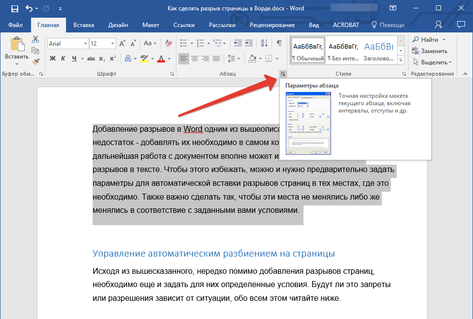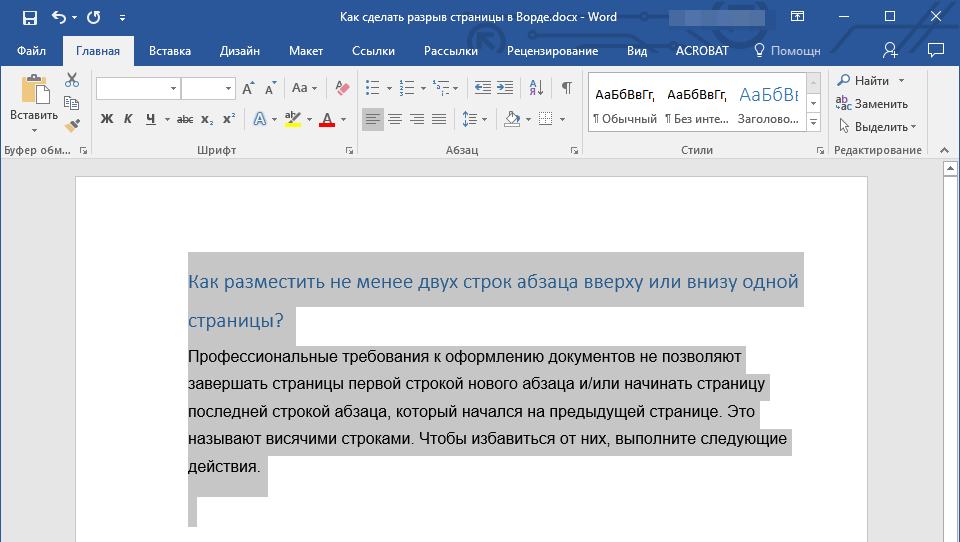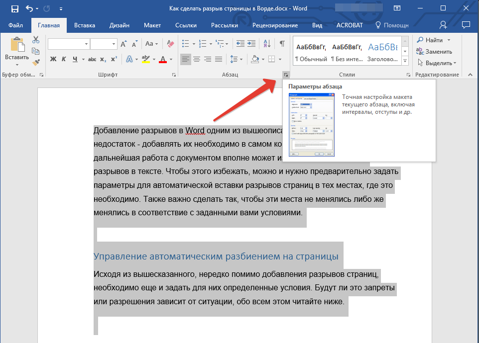 1. Выделите абзац, для которого вы хотите запретить добавление разрыва страницы.