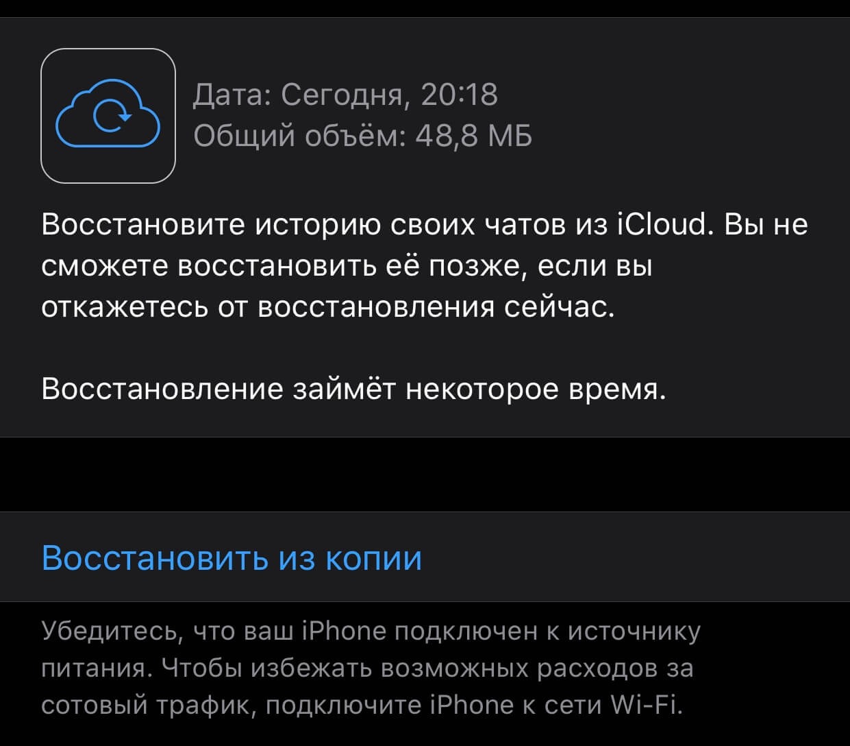 Если резервная копия создана, она отобразится в соответствующем блоке. Нажимаем на нее и подтверждаем восстановление.