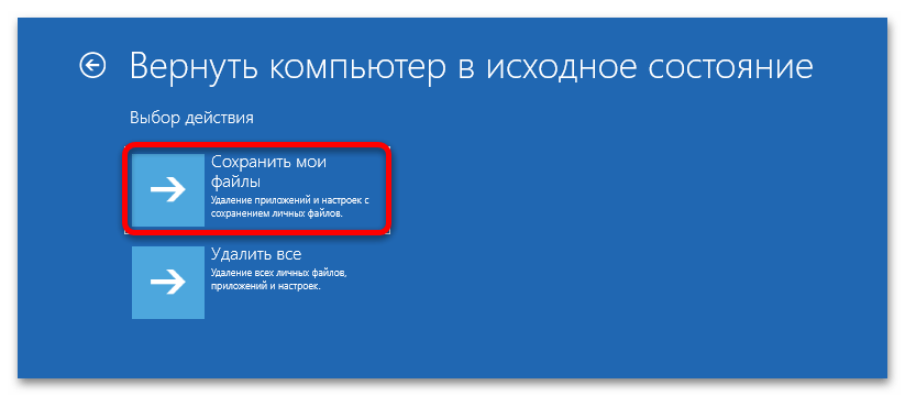 После возвращайтесь к инструкции из Способа 1, поскольку алгоритм действий аналогичный – через WinRE настройте параметры восстановления с сохранением личных файлов и выполните сброс.
