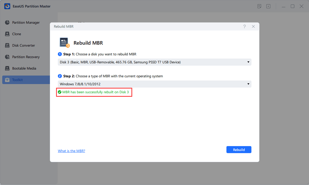 After that, you can see «MBR has been successfully rebuilt on Disk X».