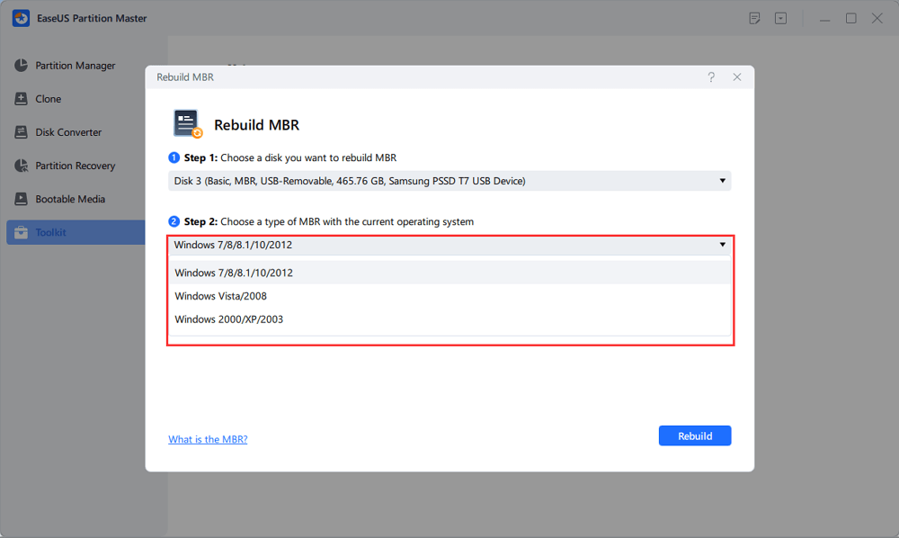 Select the disk and the type of MBR. Then, click «Rebuild».