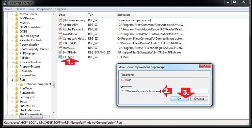 Достигнув папки Run, клацаем по ней правой кнопочкой мыши, выбираем «Создать», а затем «Строковый параметр». После этого присваиваем созданному ярлычку наименование , щелкаем на клавиатуре кнопку ПКМ и кликаем в появившемся меню вкладку «Изменить». Напоследок вводим в открывшемся окошке фразу «C:\Windows\system\ctfmon.exe»