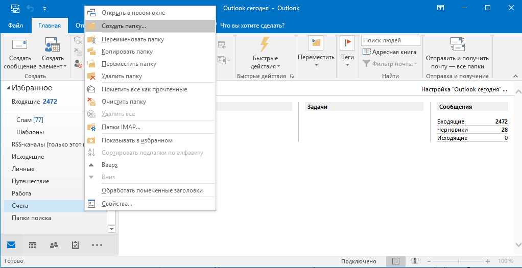 Теперь следует вернуться в Outlook 2016. В группе команд «Главная» кликаем по кнопке «Создать сообщение»