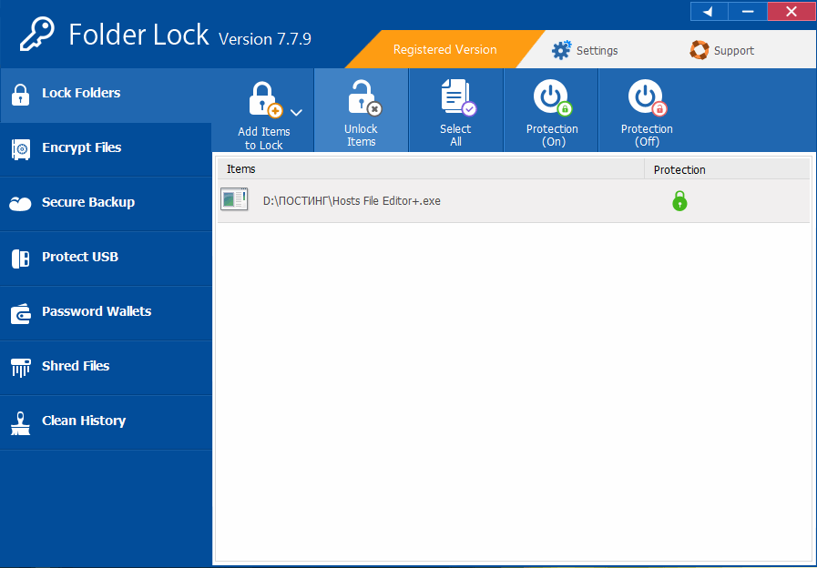 Ещё одно хорошее приложение, но уже платное, называется Folder Lock. Скачать его можно бесплатно, но для нормальной работы необходимо приобрести лицензию за 39,95 долларов. Folder Lock умеет скрывать любые файлы, папки и целые разделы диска, а также шифровать информацию. При первом запуске приложение требует установить код защиты. Если вы его забудете, то не сможете получить доступ к зашифрованным папкам и даже удалить саму программу. Чтобы запаролить файл, папку или раздел, нужно нажать на кнопку Add items to Lock и выбрать соответствующий пункт. Для шифрования информации используется вкладка Encrypt Files.