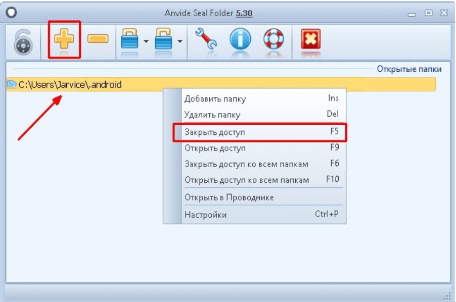 Чтобы добавить папку в Anvide Lock Folder, нужно нажать на значок в виде плюса и указать путь к каталогу. После появления его в списке кликаем по нему правой кнопкой и выбираем опцию «Закрыть доступ». Программа попросит дважды ввести пароль, после чего папка станет закрытой.