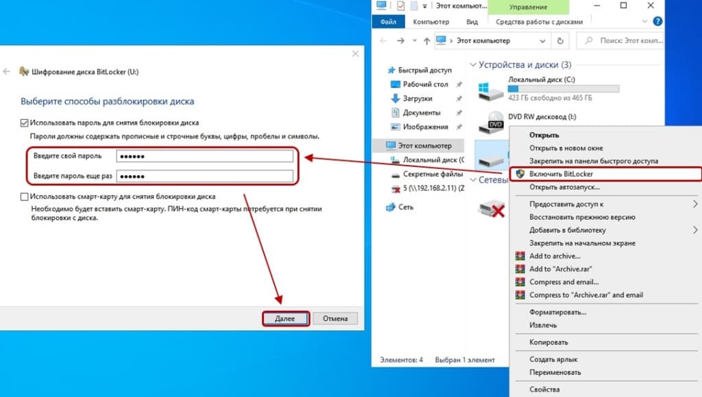 - В появившемся окне шифрования вводим пароль, а затем его подтверждение.