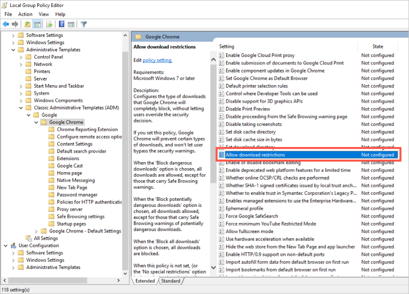 Go under Local Computer Policy > Computer Configuration > Administrative Templates > Classic Administrative Templates > Google > Google Chrome > Allow download restrictions.