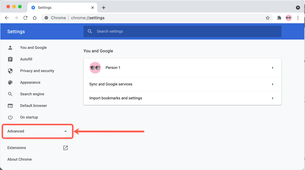 - Scroll down and at the bottom of the page, select “Advanced”.