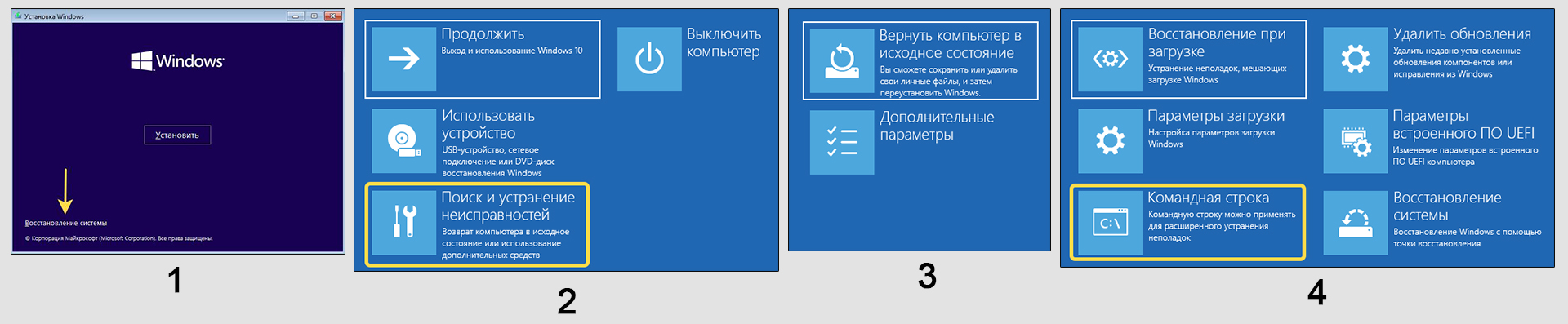 При загрузке все выполняется также с пункта №2. Нужно лишь предварительно перезагрузить ПК (актуально для 10 и 11) в режиме особых вариантов загрузки. Сделать это можно, перейдя в «Параметры» из меню «Пуск» — «Обновление и безопасность» — «Восстановление». Там нажать «Перезагрузить сейчас» под надписью «Особые варианты загрузки». Либо настроить загрузку через Биос.