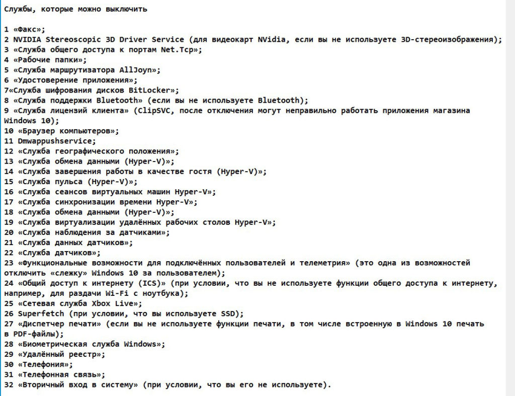 Запущенные службы это процессы связующие устройства в компьютере с операционной системой. Работают они в фоновом режиме. К сожалению, часто некоторые службы работают даже тогда, когда нет устройства, которое нужно связать с системой. Разуметься все такие службы создают дополнительную нагрузку на ваш компьютер c Windows 10. Ниже мы приведем список служб, которые любой пользователь может выключить: