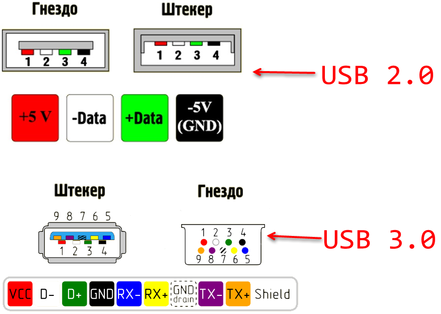 USB на сегодня является самым удобным и популярным разъёмом для подключения периферийных устройств, начиная от флешек и заканчивая внешними цифро-аналоговыми преобразователями. Как правило, на материнской плате присутствует от 2 до 4 портов такого типа с возможностью увеличения их количества путем подключения передней панели (о ней ниже). Доминирующим типом ЮСБ сейчас является тип А 2.0, однако постепенно производители переходят на стандарт 3.0, схема контактов которого отличается от предыдущей версии.