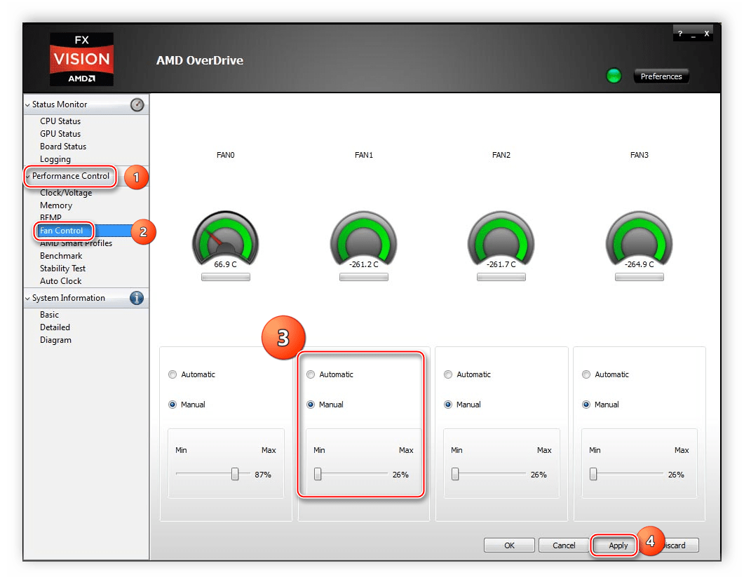 Если зафиксированное количество оборотов не подходит из-за сильного перегрева, можно поменять данные в разделе «Конфигурация». Утилита автоматически подстроится к выбранному значению.