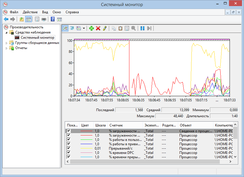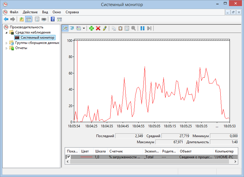 Если вы хотите увидеть производительность вашего компьютера при использовании определенного набора программ, запустите их и следите за изменениями графика. По умолчанию этот график измеряет время, которое затрачивает процессор на обработку программы (процессорное время отображается в процентах). Это основной показатель загруженности процессора.