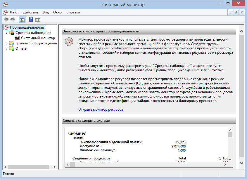 В Windows 8 инструмент можно открыть также просто. Однако если вы попробуете найти его через поиск на начальном экране, введя при этом его название, у вас ничего не выйдет. Для поиска этой программы нужно ввести perfmon.exe или perfmon.msc.
