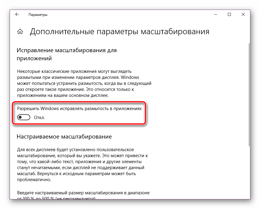 С выходом обновления 1803 в Виндовс 10 появился ряд дополнительных инструментов и функций, среди них находится и автоматическое исправление размытости. Включение этой опции происходит достаточно легко: