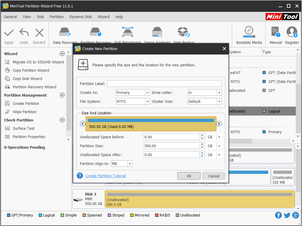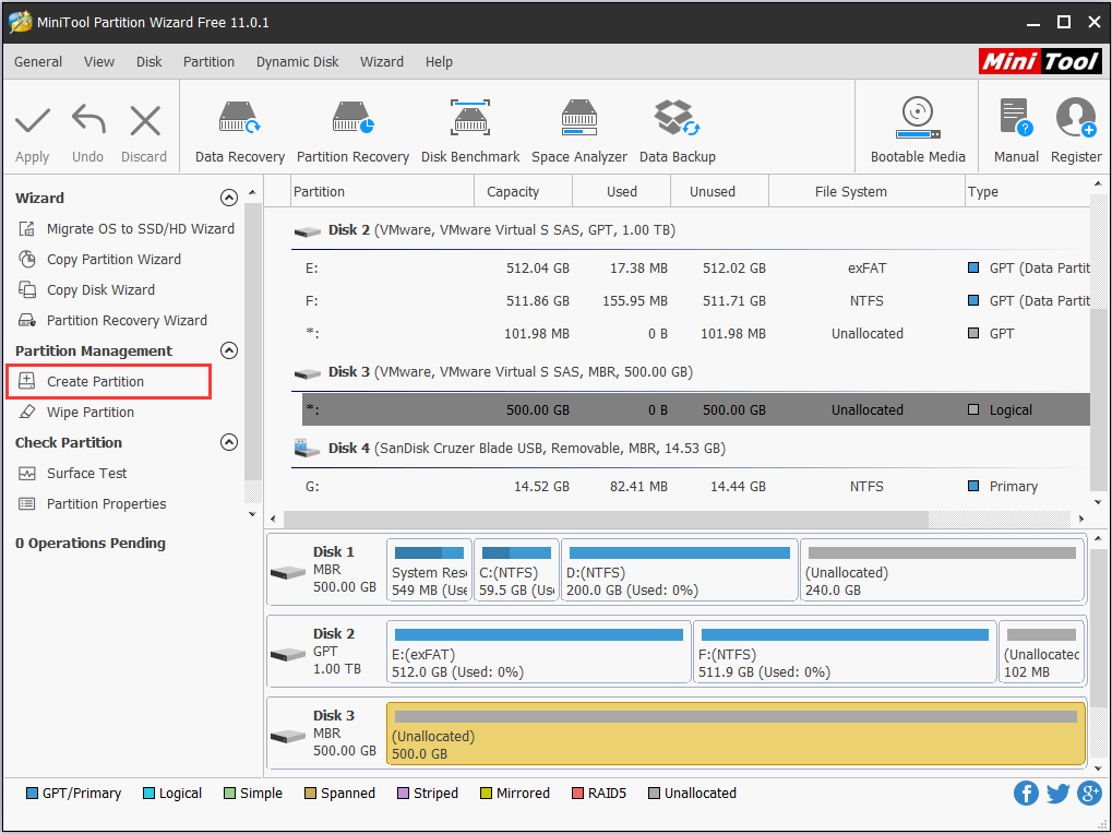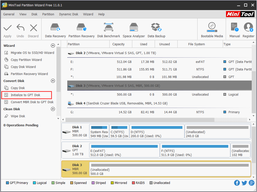 Tip: In MiniTool Partition Wizard, all new drives are regarded as MBR disk by default. Hence, you can go ahead and create new partitions on the external hard drive. But if you want a GPT disk, you can select the brand-new external hard drive and employ Initialize to GPT Disk feature at first.