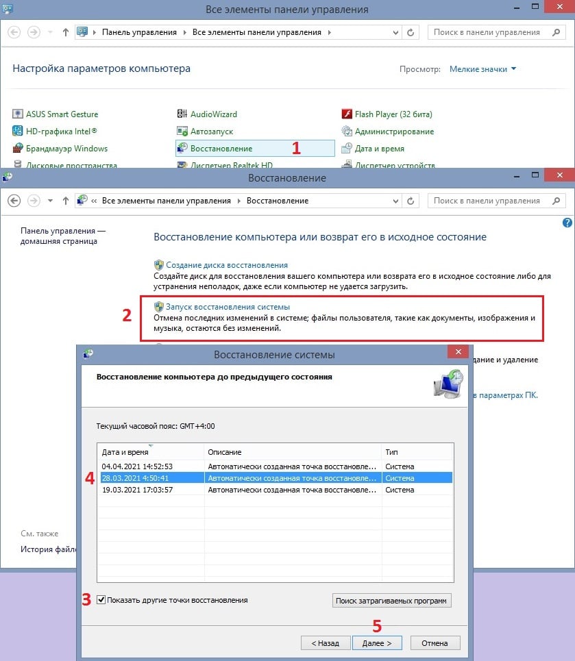 ОС Windows создаёт точку восстановления каждые несколько дней или при обнаружении серьёзных проблем. Если ни один из вышеперечисленных способов не помог, попробуйте выполнить откат до предыдущего состояния системы.