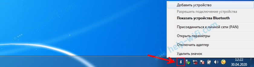 Нажав на эту иконку можно подключить новое устройство, показать все подключенные устройства, открыть настройки и т. д. Так же это можно сделать в панели управления, в разделе «Оборудование и звук» – «Устройства и принтеры» – «Устройства Bluetooth». Когда Bluetooth не установлен, не работает в Windows 7, то этой иконки в трее не будет.