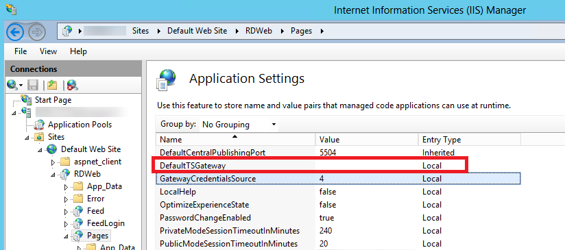 Чтобы исправить проблему, откройте консоль IIS на сервере RD Web Access. Перейдите в раздел Sites –> Default Web Site -> RDWeb -> Pages. Откройте раздел Application Settings и в параметре DefaultTSGateway укажите внешнее DNS имя вашего сервера RD Gateway, под которым он должен быть доступен внешним клиентам.