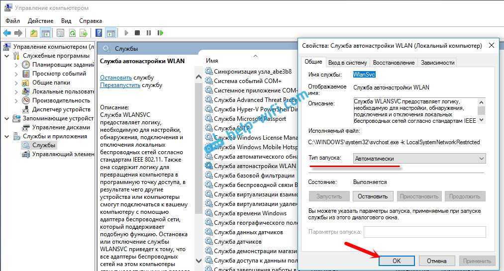 Заходим в службы (правой кнопкой на значок «Этот компьютер» и выбираем «Управление», или через панель управления), переходим в «Службы», находим «Служба автонастройки WLAN», и смотрим в каком она статусе. Она должна быть в статусе «Выполняется», а тип запуска «Автоматически». Вот так: