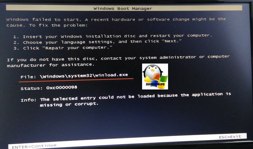 Info: Не удалось загрузить операционную систему, так как критически важный системный файл отсутствует или содержит ошибки.