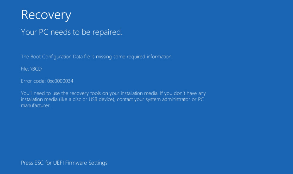 I’ve got this blue screen every time I start up my computer: Your PC/Device needs to be repaired. The Boot Configuration Data file is missing some required information. File: \BCD. Error code: 0xc000000d. You’ll need to use recovery tools. How can I fix it? I’m using Windows 10.