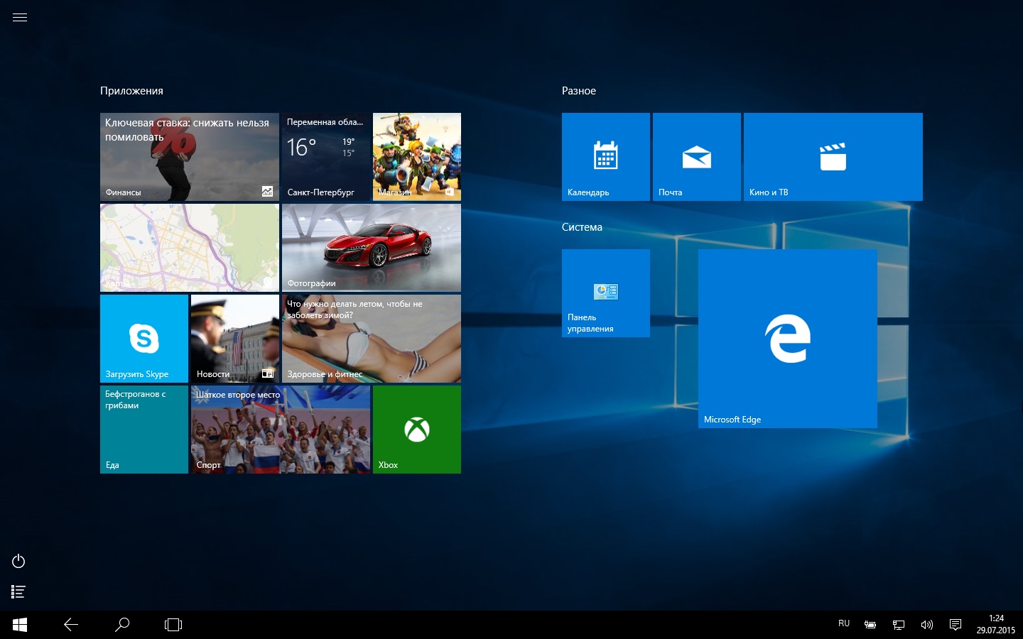 Из предустановленных программ присутствует браузер нового поколения — Microsoft Edge; помощник Cortana; дополнение для сенсорных экранов; стандартные видео и музыка, фото и почта, календарь и карты.