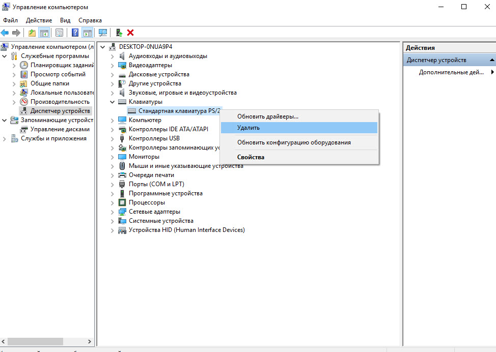 Нажмите правой кнопкой мыши на клавиатуру и выберите Удалить