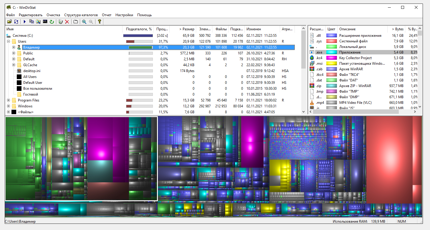 Программа WinDirStat выполнит анализ и покажет, что убирать с диска «С» в Windows