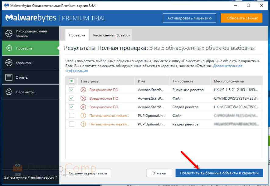 Также вы можете воспользоваться еще одной бесплатной программой, чтобы очистить компьютер от вирусов. Скачайте программу Malwarebytes и следуйте простой установке. Бесплатной версии программы сроком на 14 дней вам хватит, чтобы полностью очистить ваш компьютер от вредоносного ПО. Совершите сканирование и после нажмите на «Поместить выбранные объекты в карантин».