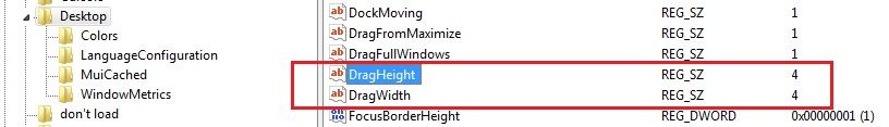 - Перейдите по пути , вставив адрес в адресную строку или развернув соответствующие ветки на панели слева. В центральной части окна найдите параметры «DragHeight» и «DragWidth», отвечающие за высоту и ширину масштаба соответственно. Поочередно измените у них значения, дважды кликнув по названию.