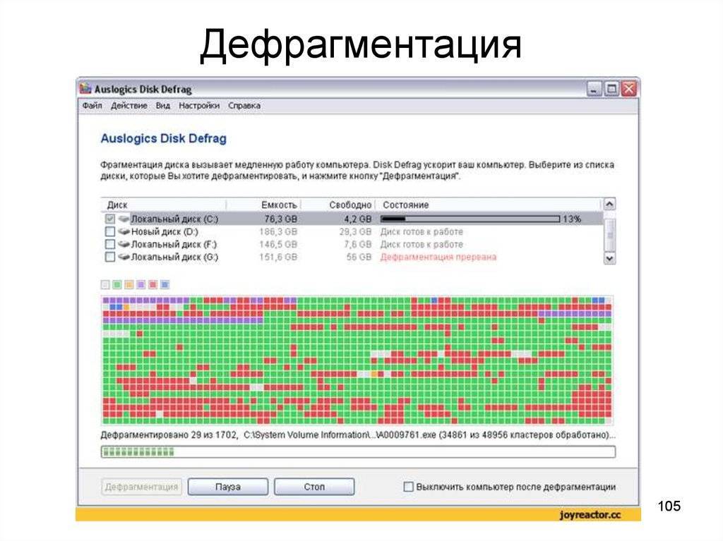 При записи любых файлов на жесткий диск вся информация распределяется по кластерам. Если вы решите удалить тот или иной файл, кластеры с информацией сотрутся, но вместо них останется пустое место. Таким образом нарушается упорядоченность всех файлов на жестком диске. В результате этого при считывании информации винчестер тратит гораздо больше времени на поиск нужных кластеров, поскольку они разбросаны по всему носителю. Это приводит к заметному замедлению работы компьютера в целом. Такой процесс называется фрагментацией.