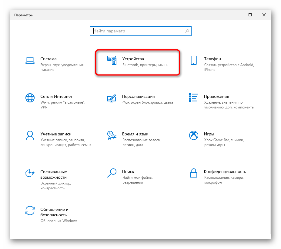 - В том же меню «Параметры» на этот раз выберите плитку «Устройства».
