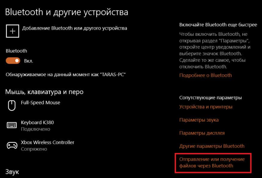Для передачи файлов по Bluetooth в Windows 10 делаем следующее: