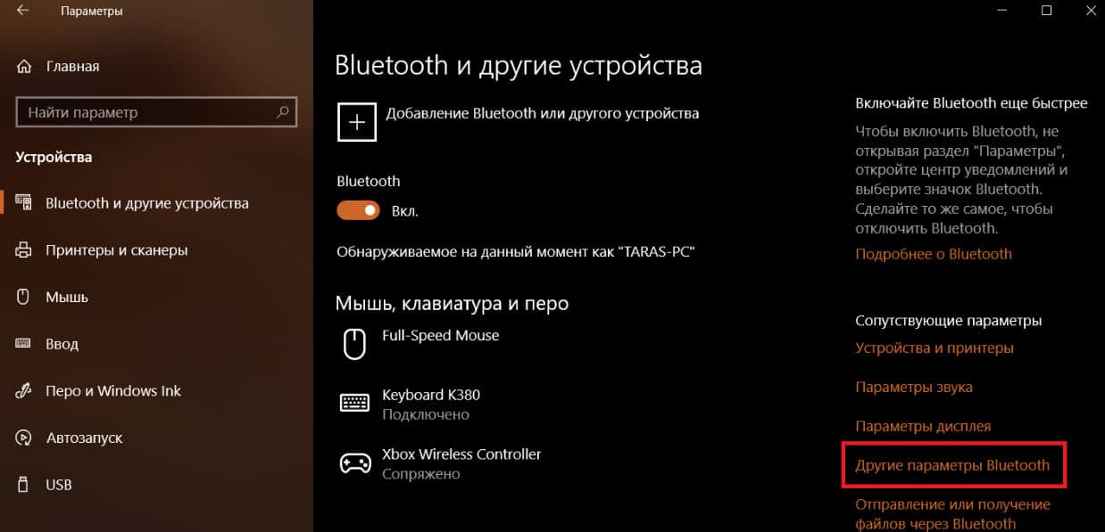 Для этого пользователь должен в этом окне кликнуть на значок «Другие параметры Bluetooth».