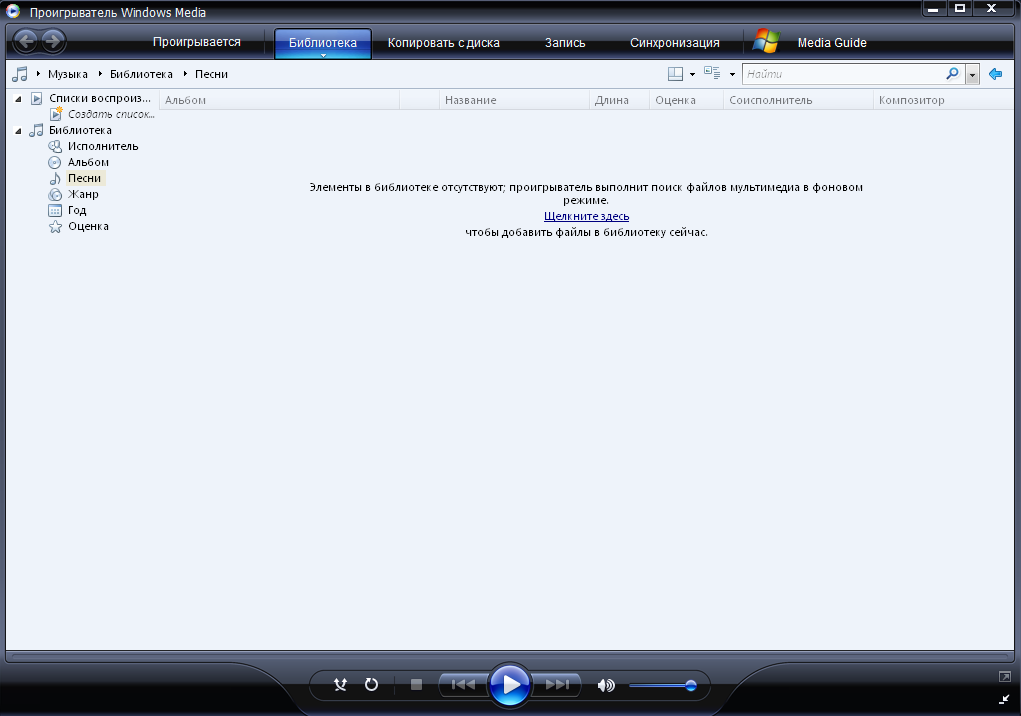Для просмотра и редактирования списка композиций, их поиска и упорядочения, записи компакт-дисков и работы с переносными устройствами используется режим библиотеки (рис. 6.13). В этот режим проигрыватель переходит автоматически после запуска из меню Пуск или с помощью значка на Панели задач. Из режима воспроизведения в режим библиотеки можно перейти с помощью кнопки в правом нижнем углу окна или сочетания клавиш CtrL+1.