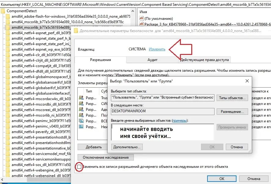 Если в какой-то момент ключи или конкретные параметры засопротивляются, заимейте на них права из контекстного меню всего раздела ComponentBasedServicing через Разрешения… Выберем Дополнительно – сменим Владельца, выбрав Изменить, и в поле выбора учётной записи введите (или начните вводить) имя собственной учётной записи. Перед Применить замените наследования и разрешения в чек-боксах окна, выставив в оконцовке разрешения Администраторам: