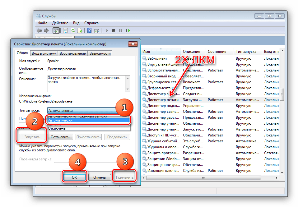 На вкладке «Общие», напротив пункта «Тип запуска» должно быть установлено значение «Автоматически». Если это не так исправьте. Также в «Состояние» должна быть активна кнопка «Остановить», если это не так, то нажмите на кнопку «Запустить» и сохраните изменения, нажав на «ОК». Теперь снова щелкните правой кнопкой мыши по названию службы «Диспетчер печати» и найдите надпись «Запустить». Нажмите ее. Нет такой надписи? Значит все в порядке и вы сделали все верно.