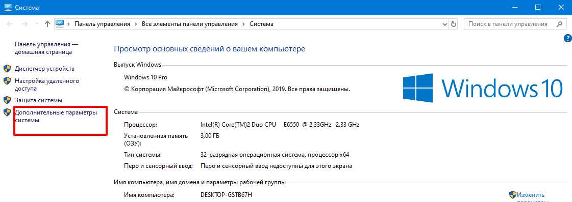 Откроется страница с информацией о системе. Перейдите к «Дополнительные настройки системы» в меню левой боковой панели.