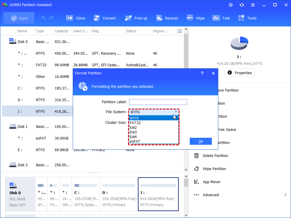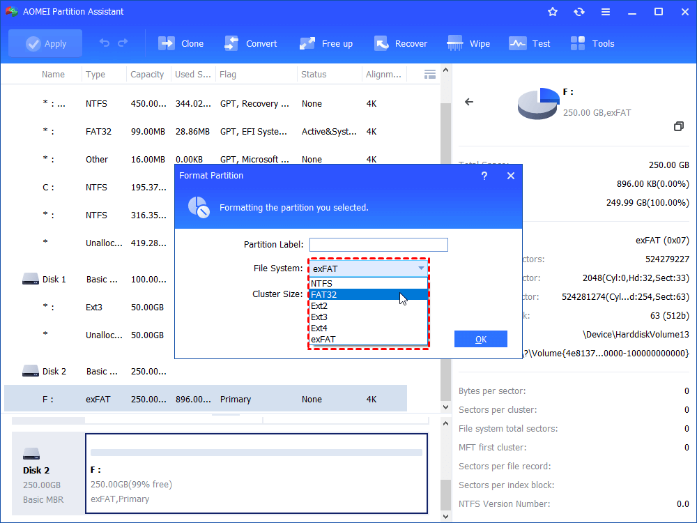 Step 3. You can format the disk to NTFS, FAT32, Ext4/3/2, exFAT, FAT32. Choose one among listed File Systems. Then, click on OK.