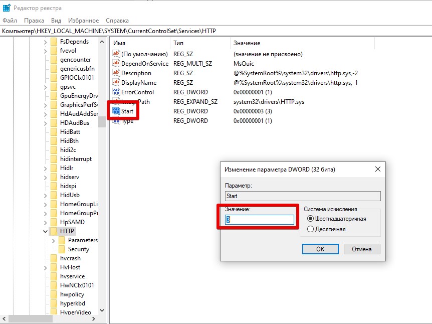 - Среди параметров справа ищем «Start». По умолчанию должно быть значение 3, если установлено другое – двойным кликом по параметру вызываем окно установки значения и ставим 3.