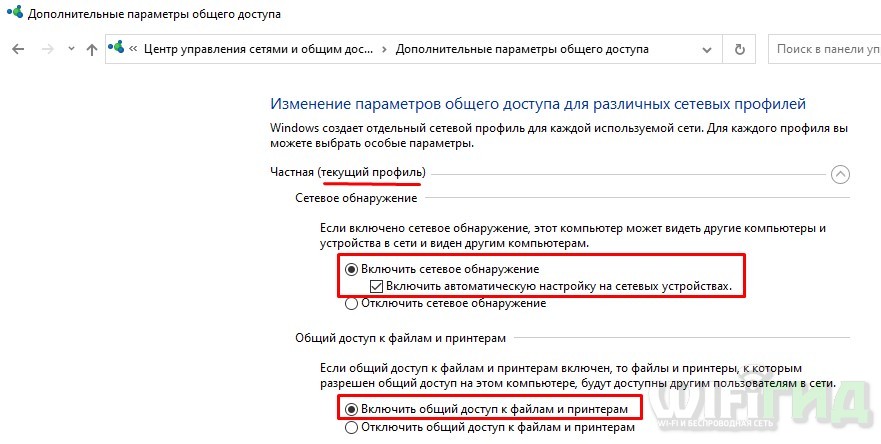 - В разделе «Частные» сети нужно включить сетевое обнаружение и общий доступ к файлам и принтерам – в противном случае ПК в сети будет виден, а вот доступ к нему будет закрыт