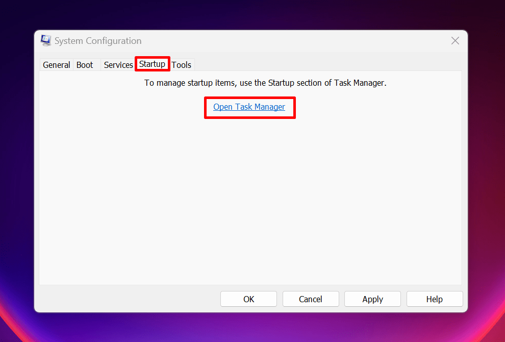 - Switch to the “Startup” tab, and click “Open Task Manager.”