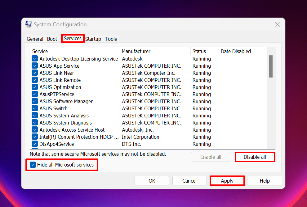 - Switch to the “Services” tab, and choose “Hide all Microsoft services” at the bottom. Click “Disable all,” then “Apply -> OK.”