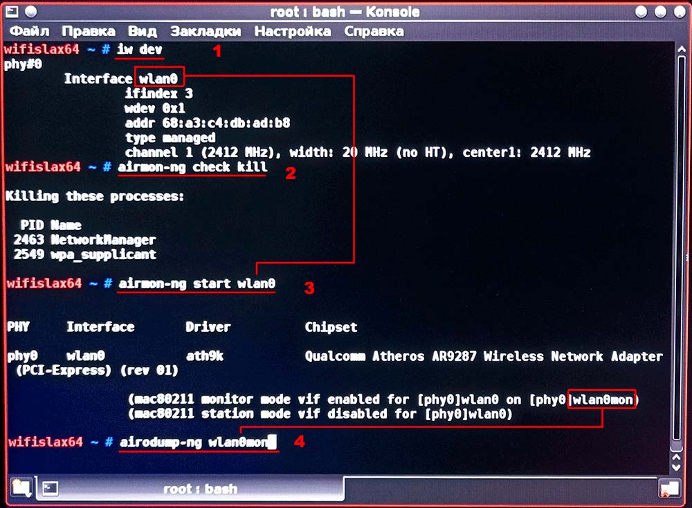 Их нужно завершить с помощью kill. Дальше нам нужно просканировать эфир и найти нашу сеть, которую мы собираемся тестировать. Для этого используйте команду airodump-ng. В параметрах ей нужно передать только интерфейс