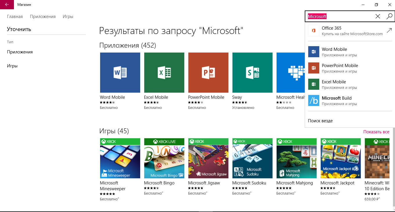 - Введите в строке поиска слово «Microsoft», чтобы увидеть все приложения, которые выпускает компания. В их числе будут и стандартные. Результаты поиска будут как на рисунке ниже;