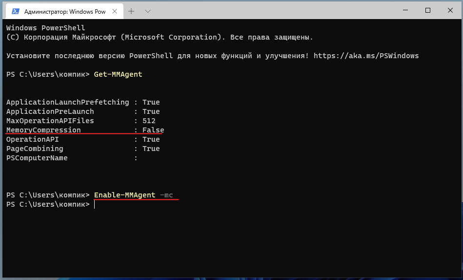 Если же нужно проверить, включена ли сжатая память или нет вообще, выполняем команду Get-MMAgent и смотрим значение параметра MemoryCompression.