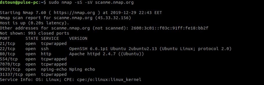 Однако в производственных средах запускать SYN-сканирование не рекомендуется, так как это может привести к выходу из строя некоторых нестабильных приложений. Также следует отметить, что для сканирования SYN требуются привилегии sudo, поскольку оно требует обработки неформатированных пакетов.