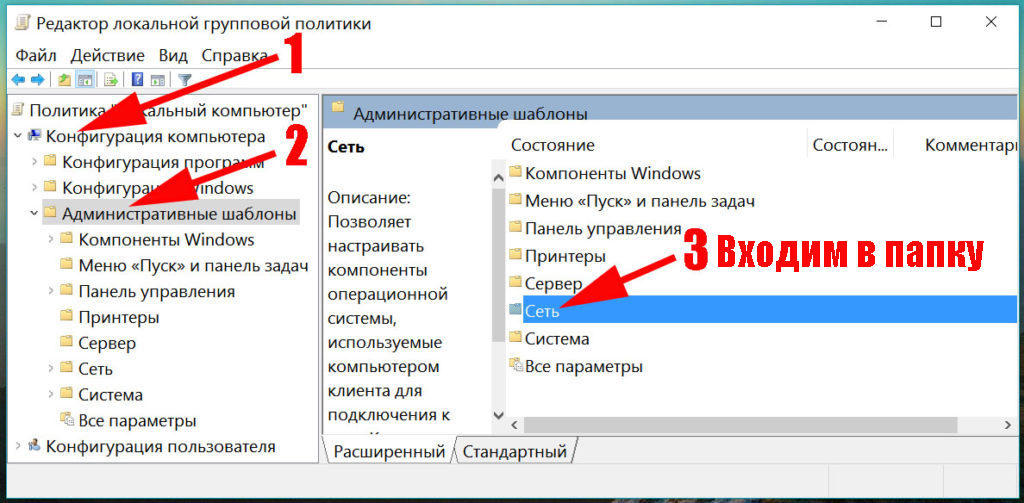 Раскройте раздел «Конфигурация компьютера», чуть ниже «Административные шаблоны» и войдите в папку «Сеть».