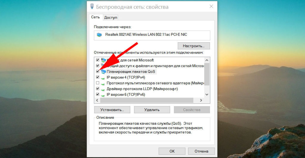 Желательно (но необязательно) убедиться, чтобы на сетевой карте стояла птичка напротив «Планировщик пакетов Qos».